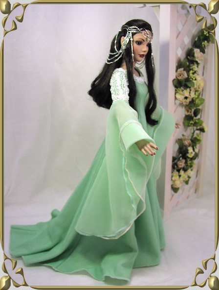 Green was the color chosen by LOTR director Peter Jackson "to represent new beginnings." To capture the elven ethereal quality, I layered three fabrics in the dress - the middle layer has silver threads that show thru the top layer to create a slight shimmering effect. Neckline and sleeve decoration is a white with irredescent & pearl trim - it has been hand-beaded with pastel yellow beads and sequins. "Butterfly wing" headress features silver wire and